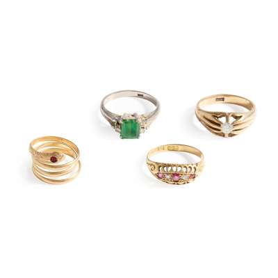 Including an early 20th century 18ct gold ruby and diamond five-stone ring; a diamond single-stone ring, stamped 18CT; a child's snake ring, with garnet set eye, stamped 750; and an emerald and diamond dress ring, stamped 18K (one stone deficient) (4)