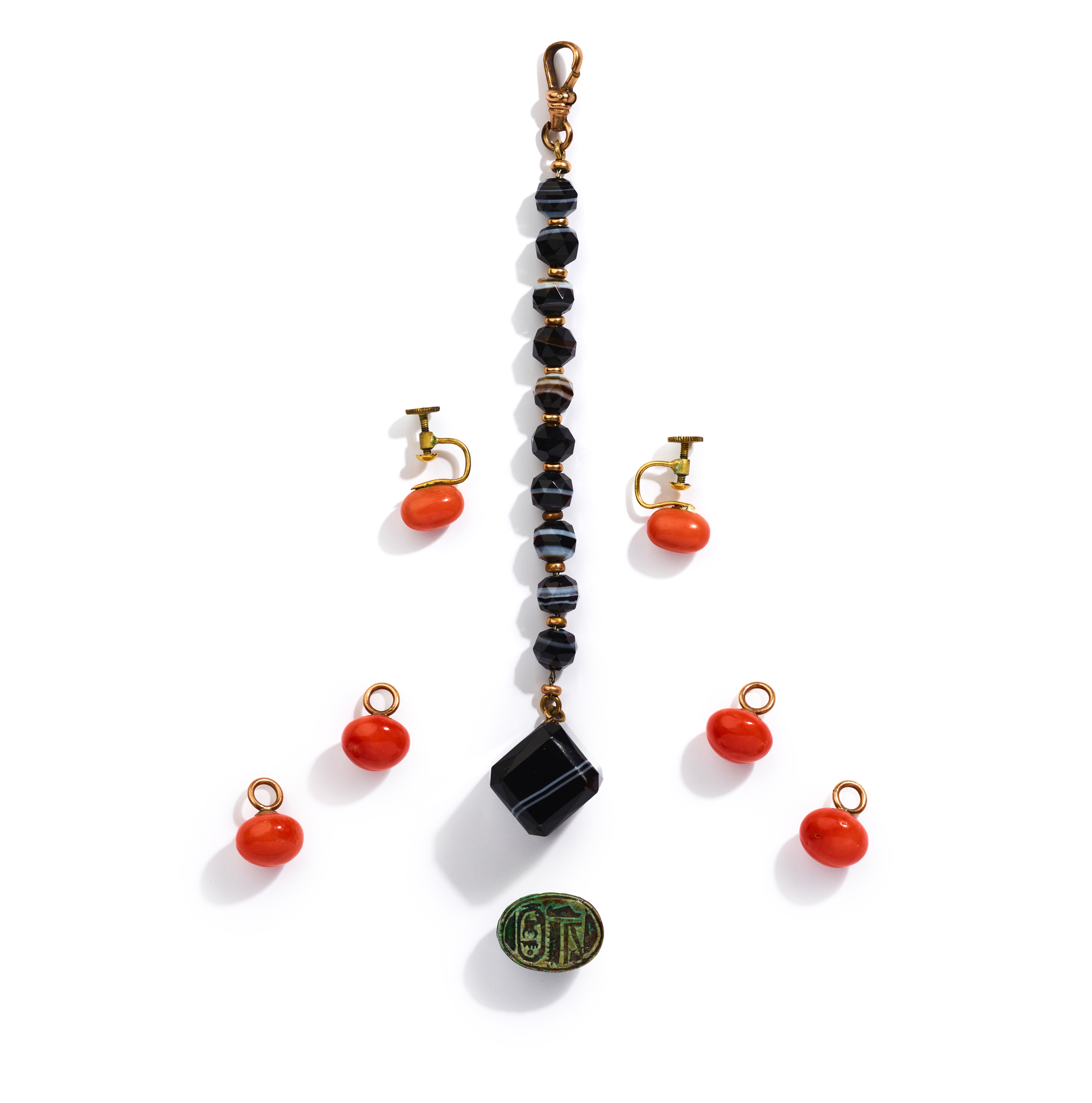 Including a Victorian banded agate fob, composed of a single strand of faceted spherical beads, suspending a cube drop, to a dog-clip clasp, unmarked; an Egyptian revival faience scarab, unmounted; a pair of coral earrings, with screw-back fittings, unmarked; and a set of four coral cabochon buttons, with loop fittings, unmarked (4)