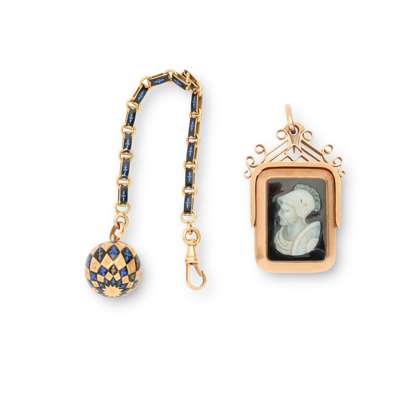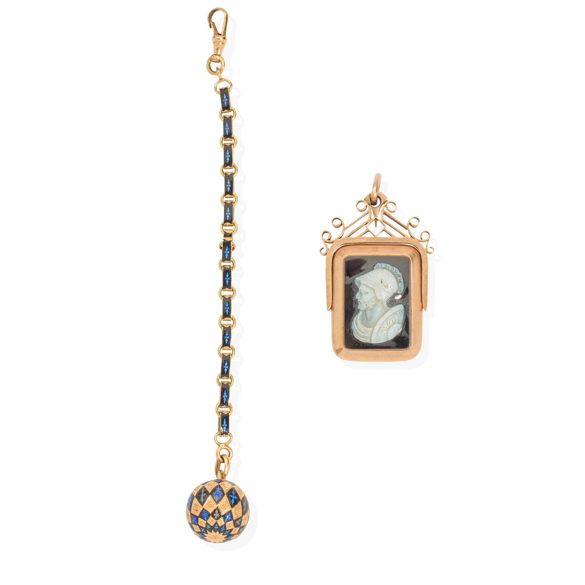 The rectangular fob set with an agate cameo of a Grecian soldier, and a plain agate panel to reverse, unmarked; together with a blue enamel globular fob, suspended from enamel links, engraved detail, unmarked (2)