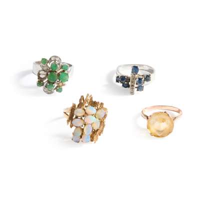 Including an opal cluster dress ring, stamped 14K; a citrine single-stone cocktail ring, stamped mark; a blue sapphire and white sapphire dress ring, unmarked; and an emerald and white sapphire cluster dress ring, unmarked (stone deficient) (4)