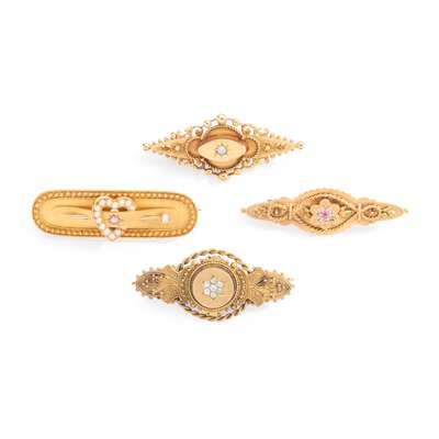 Including a Victorian 15ct gold star set diamond and seed pearl heart motif bar brooch; a Victorian 15ct gold diamond and ruby flower motif bar brooch; a Victorian 18ct gold star set diamond brooch; and a Victorian diamond flower cluster bar brooch, stamped 15CT (4)
