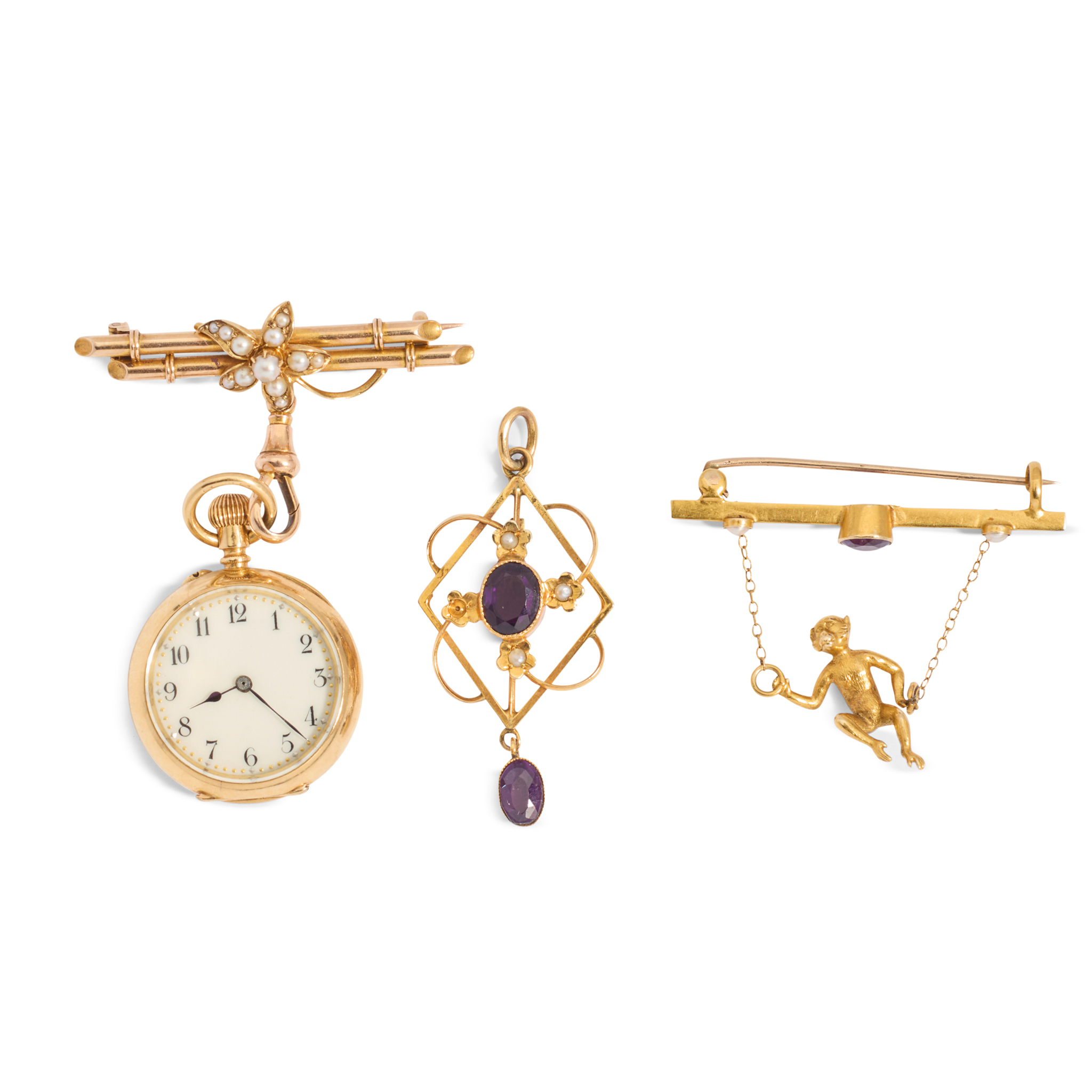 Including a Victorian seed pearl set floral bar brooch, unmarked, with dog clip clasp, stamped 15, suspending an 18ct gold open-faced fob watch, movement unsigned, case numbered, Swiss hallmarks; an Edwardian amethyst and seed pearl bar brooch, suspending a seated figure of a chimpanzee, stamped 15; and an Edwardian paste and seed pearl openwork drop pendant, stamped 9ct (3)