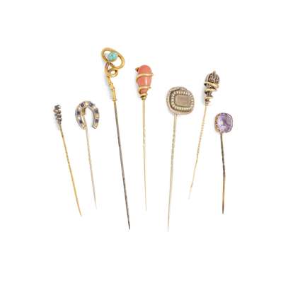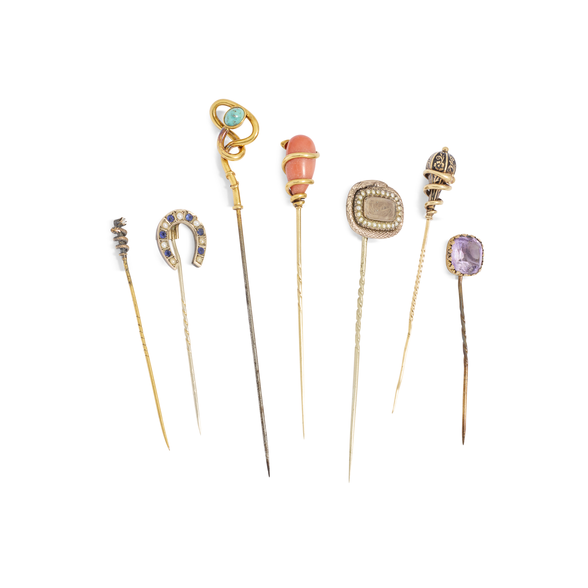 Including a cushion-cut amethyst tie pin, a sapphire and halved-pearl horseshoe stickpin; a hairwork and seed pearl plaque pin within a serpent border, a black enamel stickpin; a coral and coiled serpent tie pin; and another set with a small round-cut diamond, a turquoise tie-pin, stamped 9ct (7)