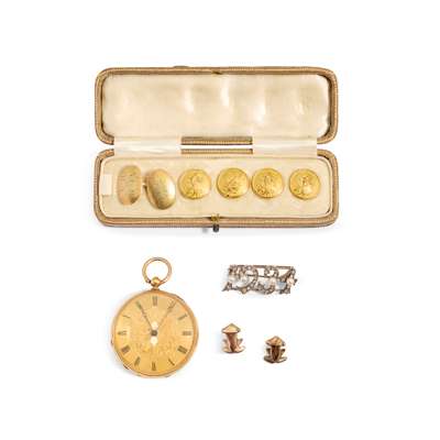 Including an open-faced pocket watch, stamped K18; a pair of frog earrings, unmarked; a single cufflink and a partial set of cased buttons (qty)
