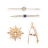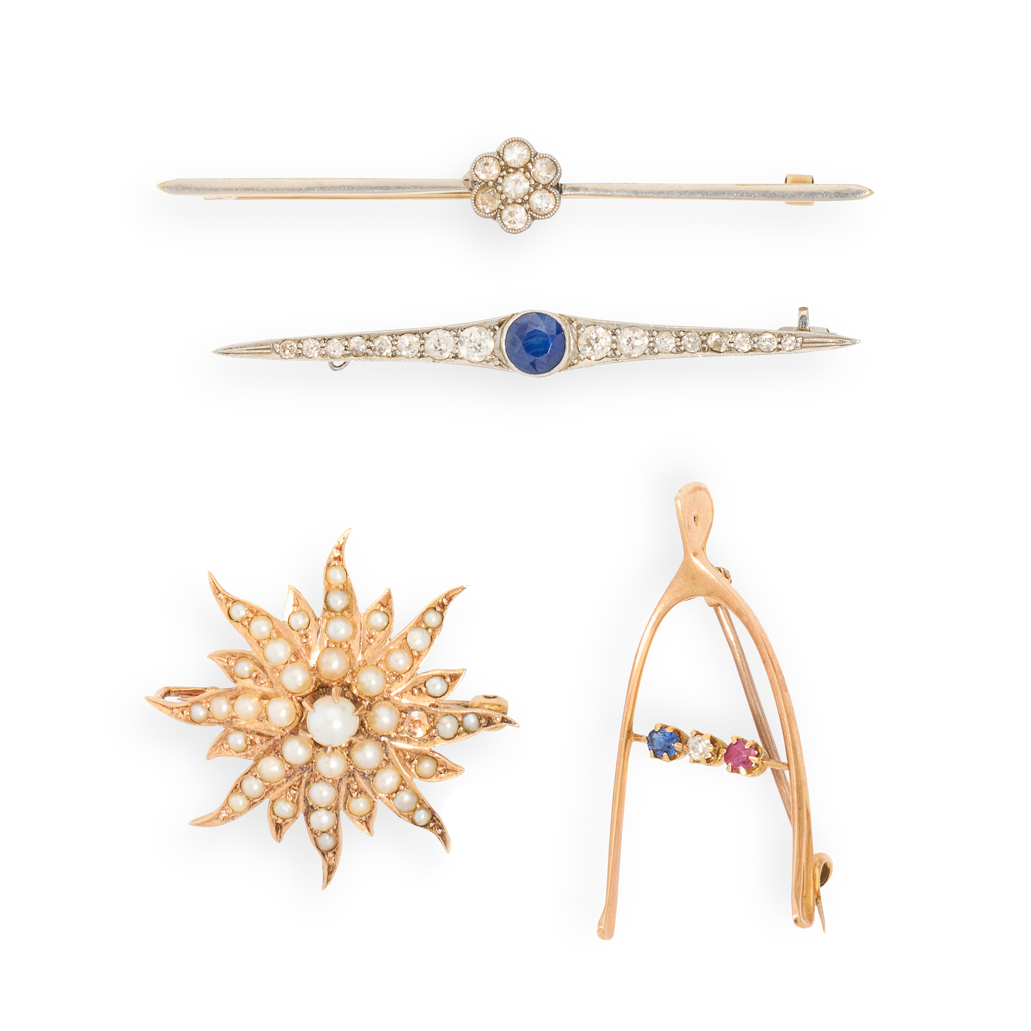 Including an Edwardian seed pearl star brooch pendant, unmarked; an Art Deco sapphire and diamond bar brooch, unmarked; a diamond flower cluster bar brooch, unmarked; and a gem-set wishbone brooch, stamped 15ct (4)