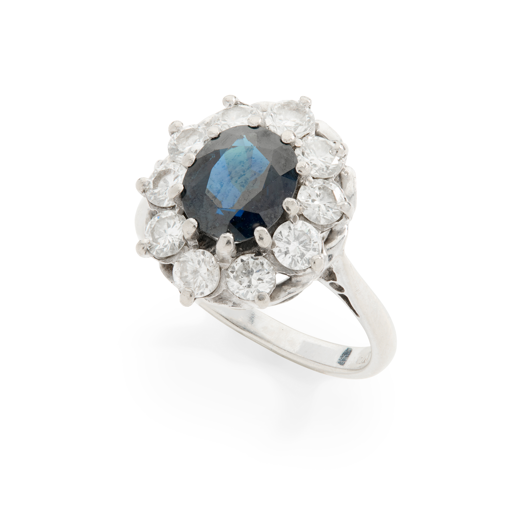 Claw-set with a faceted oval-cut sapphire, within a border of round brilliant-cut diamonds, plain band, UK hallmark