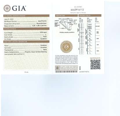 With accompanying GIA report, dated 21.06.2023, numbered 6462916112, stating that the principal diamond is 0.30cts, L colour, VVS2 clarity, showing no fluorescence.