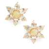 Each formed as a flower head, claw-set with an oval cabochon opal, within a border of pear-shaped grey amethysts interspaced by round-cut diamonds, stamped Au585