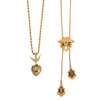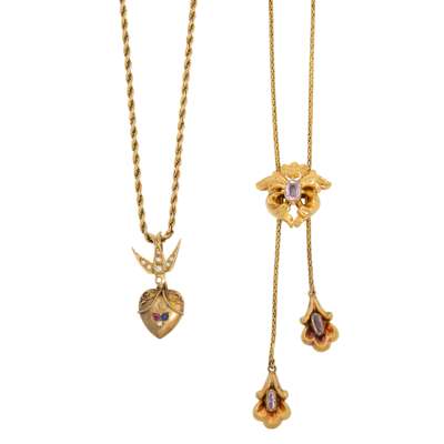 The first modelled as a seed pearl swallow, suspended a heart-shaped pendant with applied rope-twist detail, set with a small round-cut ruby, sapphire and diamond, stamped 15ct, to a rope-twist chain, stamped 9c; the second set with a pierced scrolling motif with applied cushion-cut pink gem, suspending two similarly set drops, to a fancy-link chain, unmarked (2)