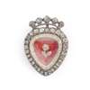 Modelled as a crowned heart, the red enamel ground set with a rose-cut diamond forget-me-not, in a white and gold enamel border spelling votre amitie fait ma felicite (your friendship makes me happy), the border and crown set with old round-cut diamonds, unmarked; in a fitted box for Parks … Regent Street, W