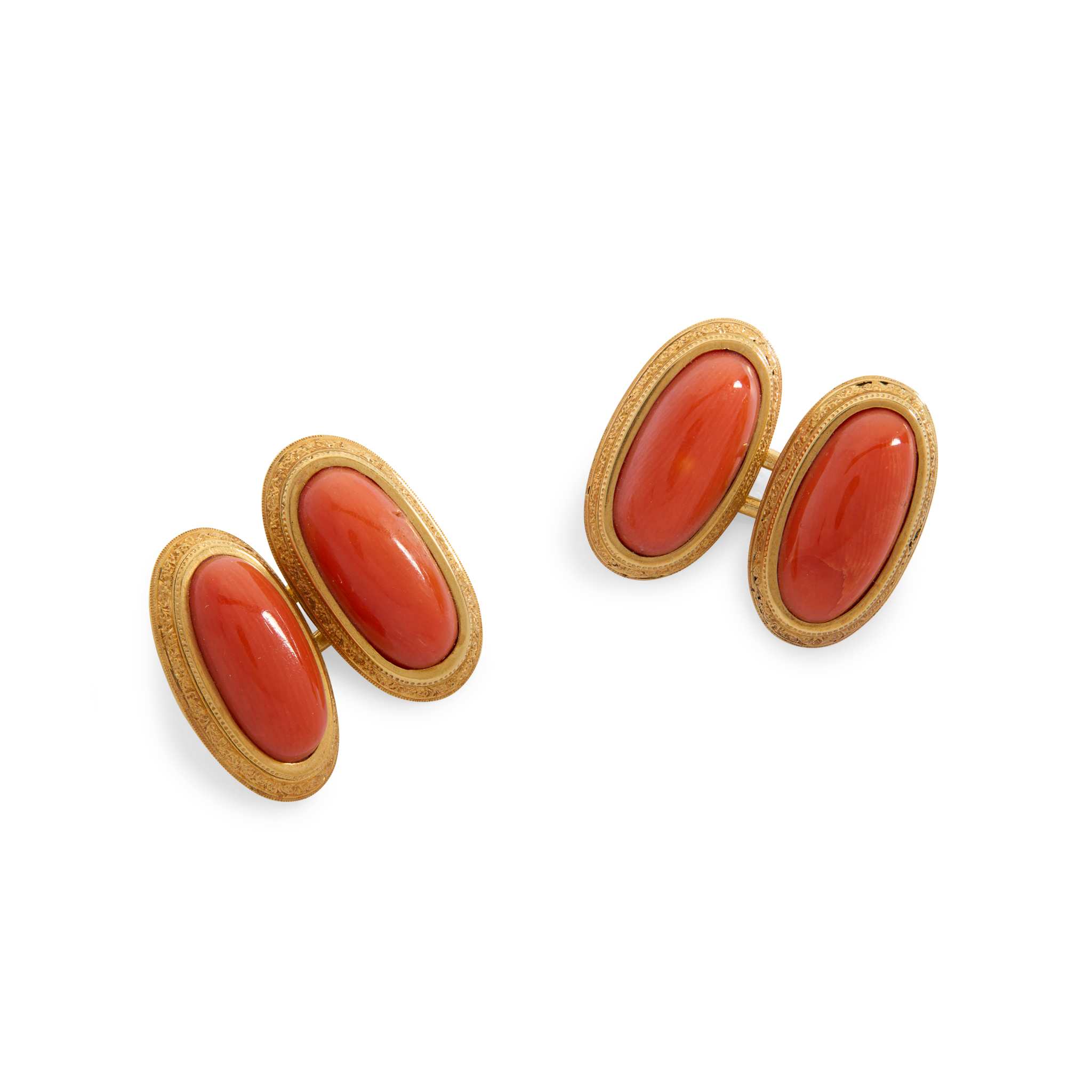 Each terminal set with a cabochon coral, the border with engraved detail, oblong joining links, indistinct marks