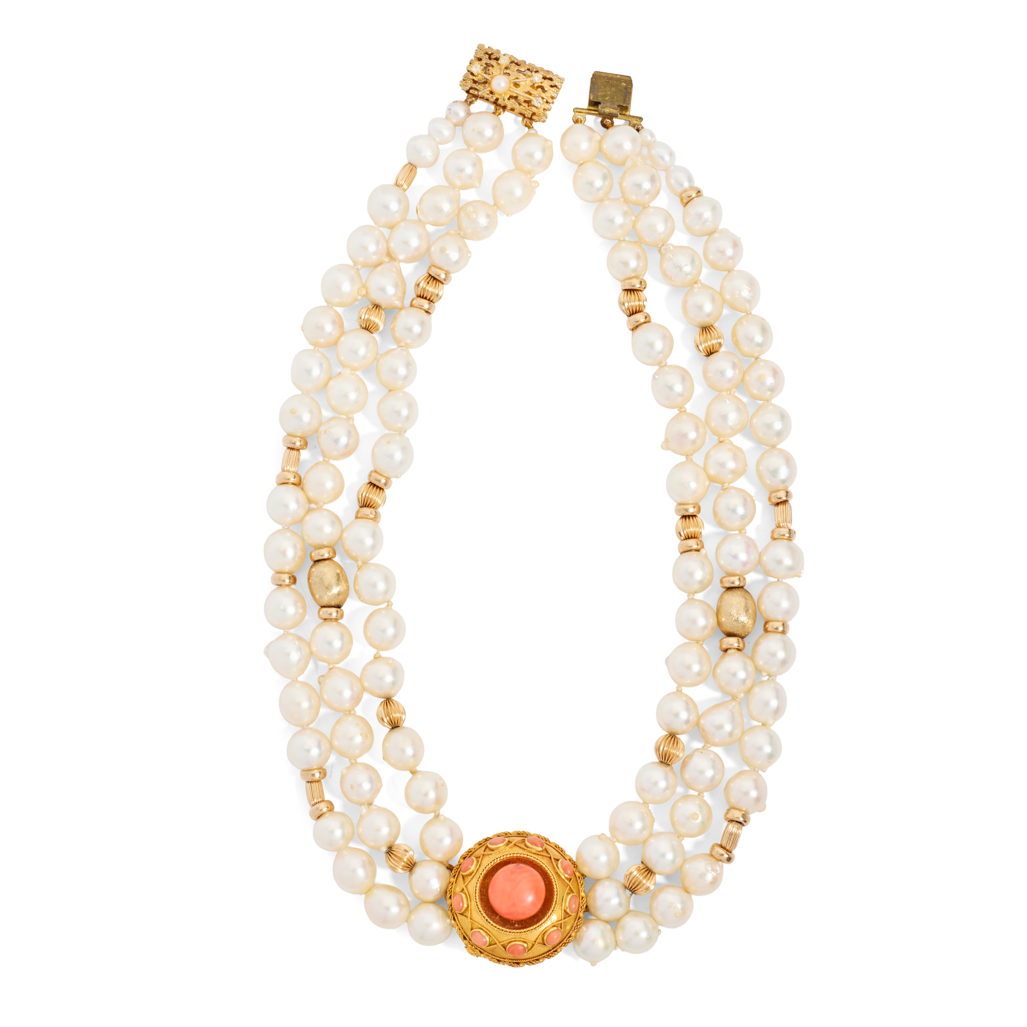 Composed of three strands of cultured pearls, set at intervals with ribbed spacer beads, centring on a 19th century cabochon coral cluster; the textured rectangular clasp set with cultured pearls and paste gems, stamped 835
