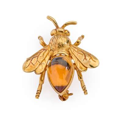 Modelled as a bee, the body set with a pear-shaped cabochon citrine, stamped 18K