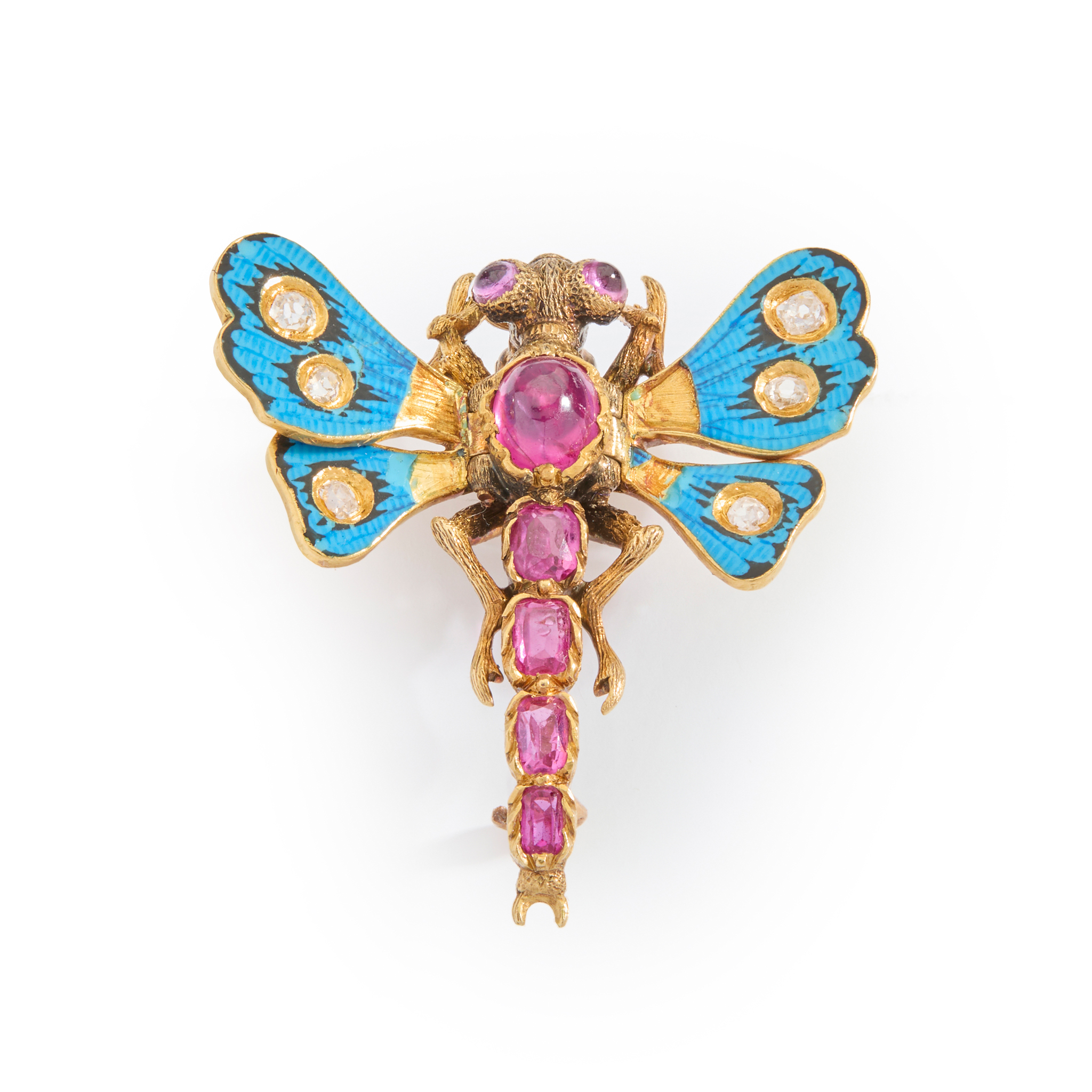 The long abdomen set with graduated cushion-cut rubies, oval cabochon ruby thorax and circular cabochon ruby eyes, within hinged moveable wings inset with eight-cut diamonds, with blue and black enamel detail, French marks