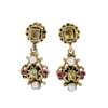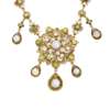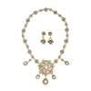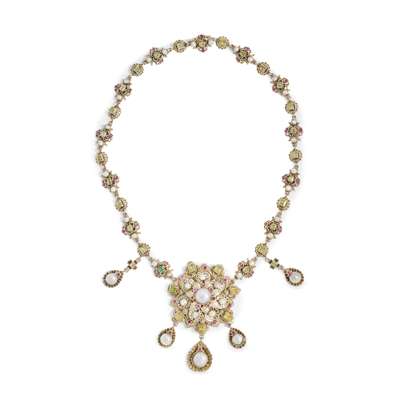 The necklace composed of a central stylised floral pendant set with blister pearls, pink and green paste, suspending pearl and pink paste tear-shaped drops, on an integrated stylised floral multi-gem set chain, unmarked; the earrings formed of floral paste-set studs, suspending scrolling stylised floral multi-gem set drops, post and butterfly fittings, unmarked