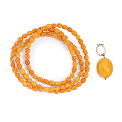 The necklace composed of a single strand of oval amber beads; the pendant of oval form, with bifurcated bale and hinged ring, stamped 925 (2)