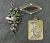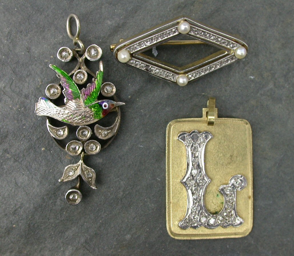 a rectangular pendant applied to the front with a single cut diamond set "L", inscribed to the reverse, stamped "750", and another diamond set pendant, with central enamelled flying bird motif (A/F) (3)