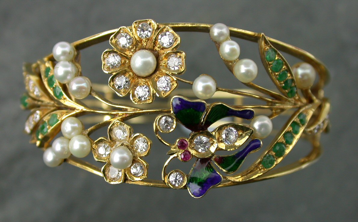 the pierced front decorated with flowers, foliage and an enamelled butterfly, set with diamonds, rubies, emeralds and pearls,