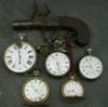 in full hunting cases, a pair cased verge pocket watch and chain, three other pocket watches and a small flintlock pocket pistol, the action inscribed Nock, London, slab butt, screw off barrel