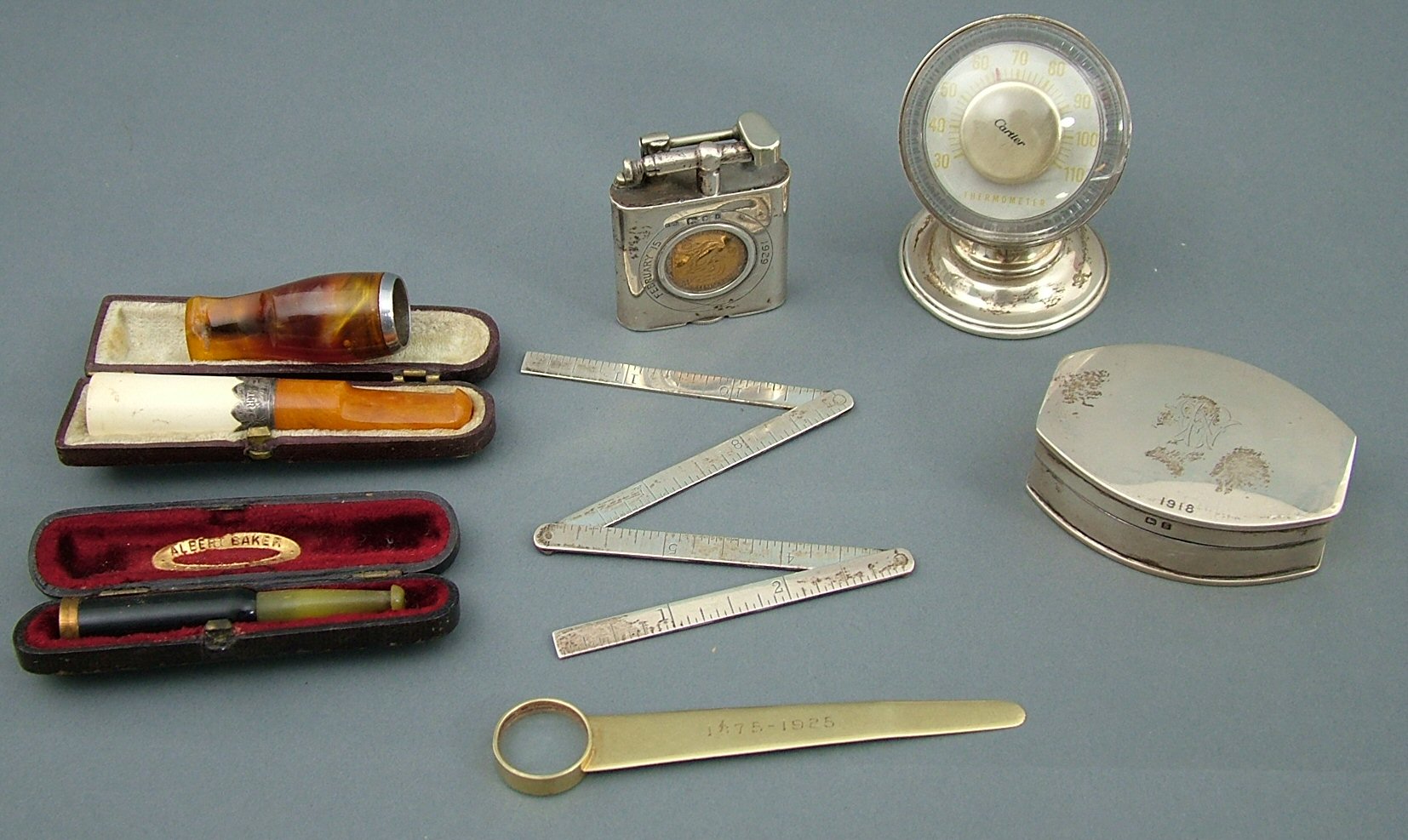 three various cheroot holders, a Cartier silver mounted thermometer, a small snuff box, a 14k small letter opener, a Sterling silver folding foot ruler