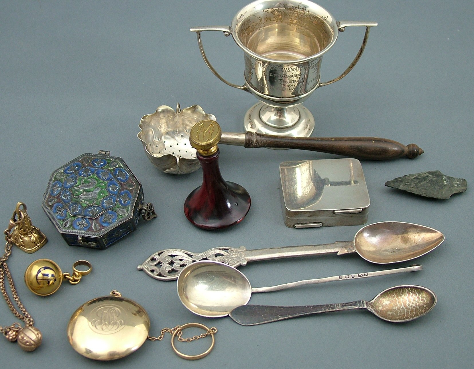 to include a Sterling silver tea strainer, three various spoons, a small trophy, a plain patch box, a seal, an enamel box and cover, a gold fob, a gold patch box and an arrow head (qty)