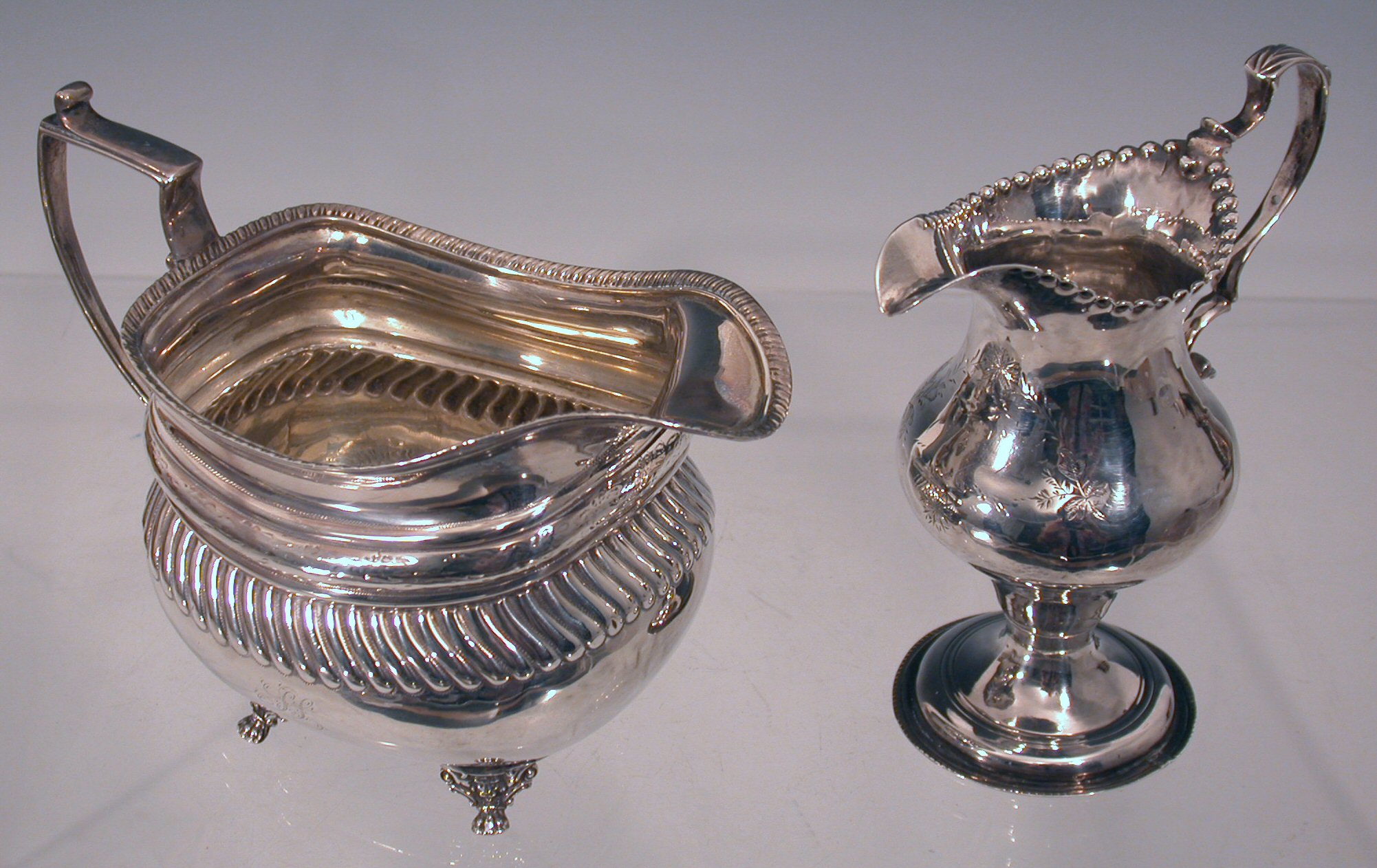 with marks for London 1781, of baluster form with "pinched" rim, scroll handle, circular spreading foot, 12cm high, together with a George III milk jug with marks for London 1793, of rounded cushion form, angular handle and cast mask feet
