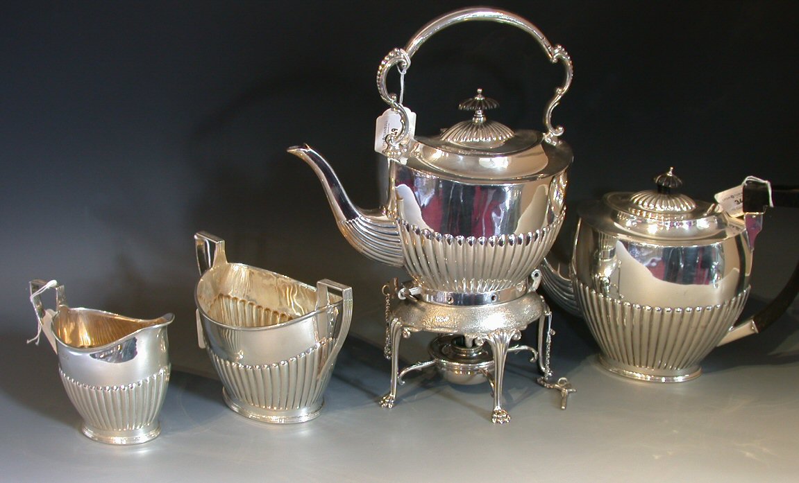 with marks for Birmingham 1897, of oval form, demi-fluted and a plated spirit kettle and stand
