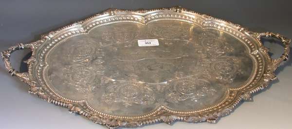 with marks for Sheffield 1895 of lobed oval form, beaded and leaf clasped border, acanthus clasped handle, the flat with engraved presentation inscription