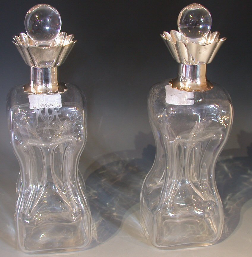 A pair of Scottish silver mounted hourglass decanters and stoppers,