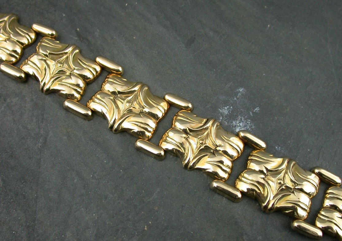 composed of broad, shaped rectangular panels with small oval links between, with snap fastening.