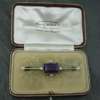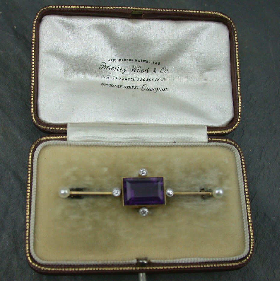 the central millegrain collet set step cut amethyst with brilliant cut diamonds to the cardinal points and seed pearl set terminals, contained in a fitted case