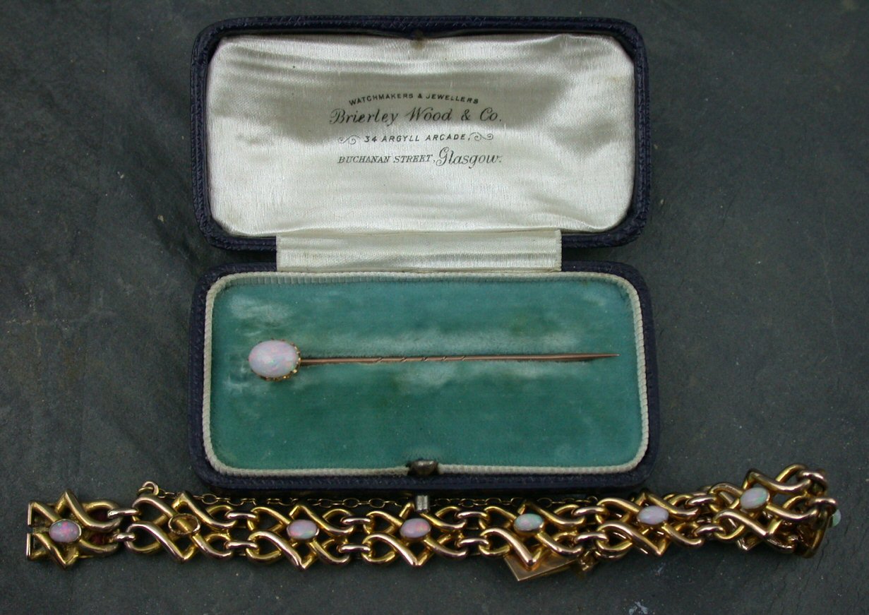 together with a stickpin with oval cabochon opal set terminal, with fitted case (2)