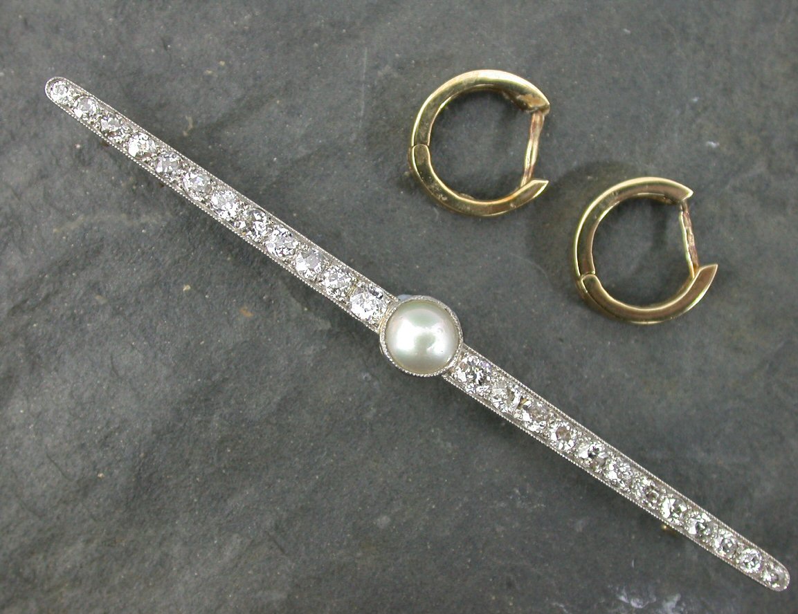 the central collet set blister pearl, flanked to either side by twelve graduated old cut diamonds, 8cm wide, and a pair of 9ct gold hoop earrings
