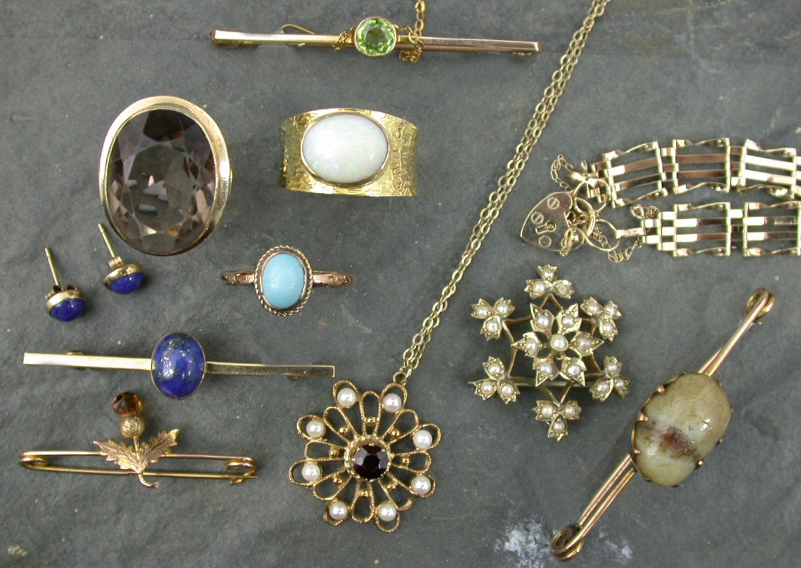 an oval cabochon opal set textured band ring stamped "18ct", a 15ct gold mounted turquoise set ring, a 9ct gold fancy gate-link bracelet, two seed pearl set pendants, a lapis lazuli set bar brooch with matching earstuds, together with three gem set bar brooches (qty)