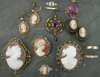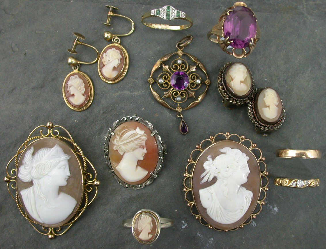 together with an 18ct gold mounted diamond three stone ring, an 18ct gold wedding band, an emerald and diamond ring, a purple paste set ring and a similarly set pendant (qty)