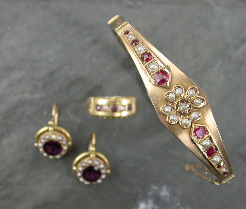 to include a pair of garnet and seed pearl pendant earrings, a 9ct gold gem set hinged bangle and a 15ct gold half-hoop ring