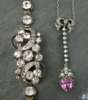 collect set with colourless stones with central scroll form cluster, 17.5cm long, with fitted case, also a pink and colourless paste set necklet, with heart shaped drop (2)