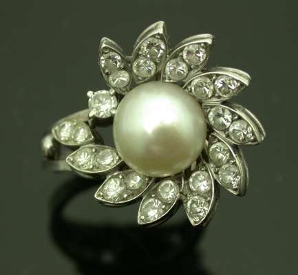 A diamond and cultured pearl floral cluster ring,