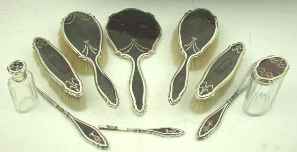 A mounted tortoiseshell lady's dressing table set,