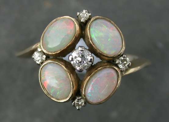 A 9ct gold mounted opal and diamond ring,