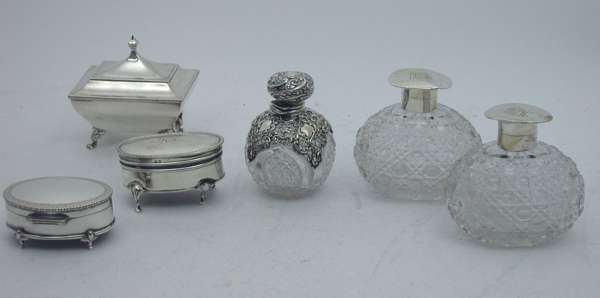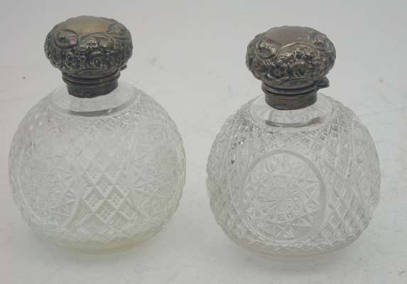 A pair of Edwardian mounted glass perfume bottles,