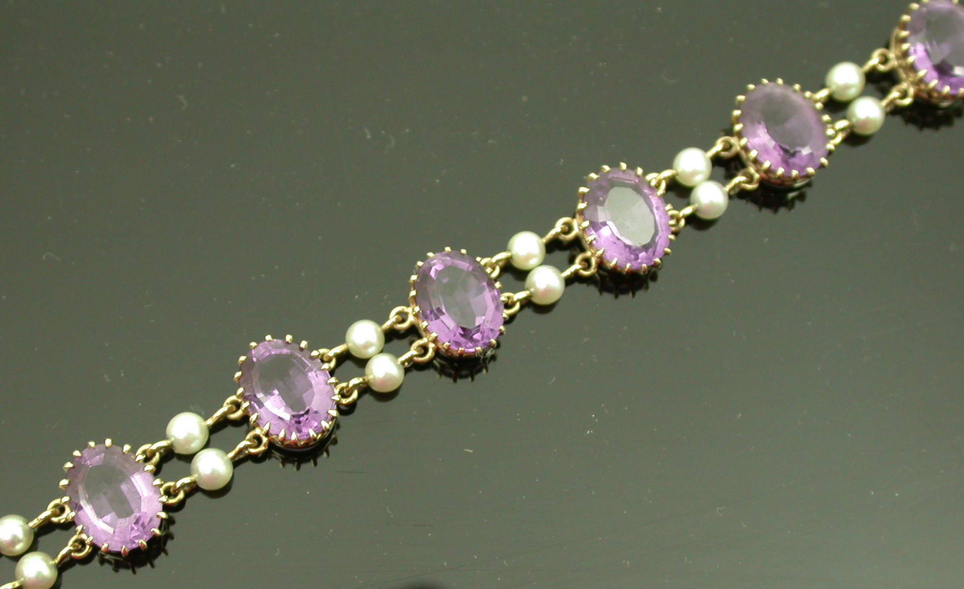 claw set with oval cut amethysts with pairs of cultured pearls between