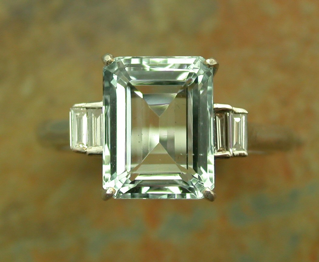 corner claw set with a trap cut aquamarine flanked to either side by two graduated baguette cut diamonds