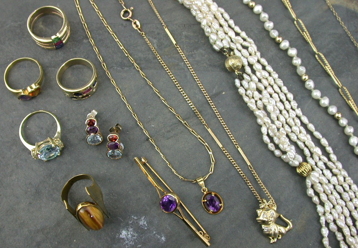 a pair of 9ct gold multi-gem set earrings, an amethyst set bar brooch and similarly set pendant, a fancy link bracelet stamped 18K, a 14ct gold diamond set cat pendant, a freshwater pearl necklace and bracelet (qty)