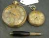 the gilt dial with black roman numerals and hands, foliate engraved to the centre, with subsidiary seconds dial with arabic numerals, with key wound movement and foliate engraved case, also another smaller 18ct gold pocket watch, similarly engraved, with key