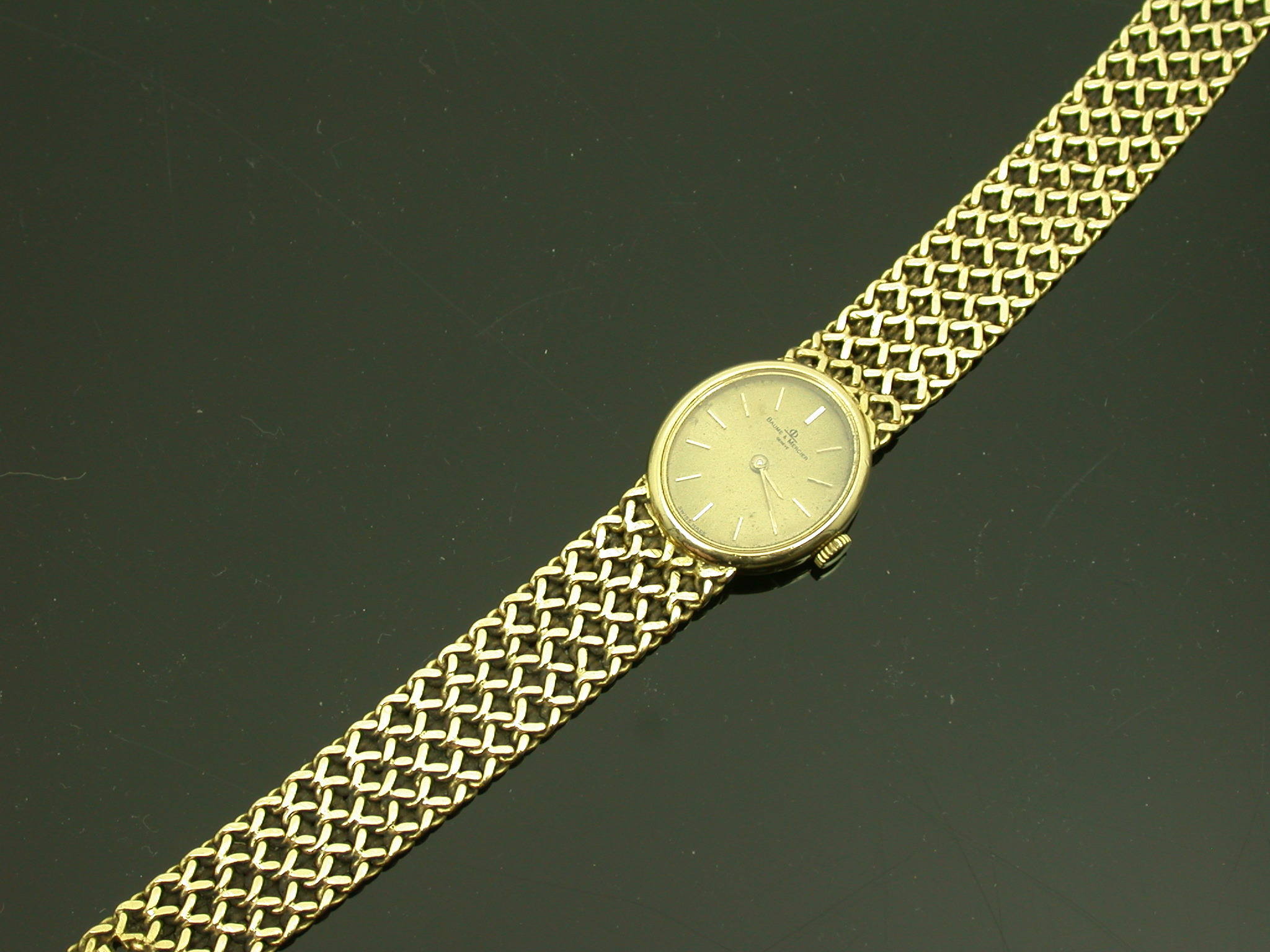 the gilt oval dial with baton numerals and hands, signed, fitted to an integral woven bracelet with foldover clasp