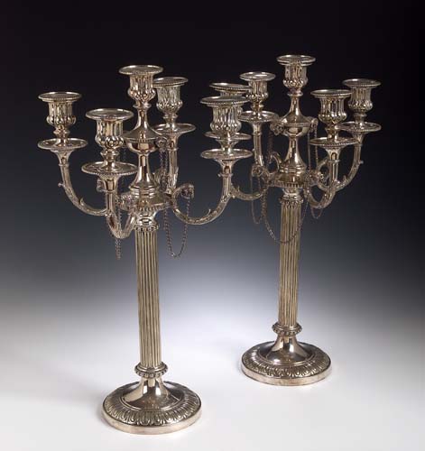 the circular bases with ovolo borders beneath fluted columns and fluted urn shaped capitals, the leaf capped branches with ram's head terminals suspending belcher link chains