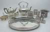 to include a large oval twin handled tray, a tea kettle, a three piece tea service, three bottle coasters and other pieces (qty)