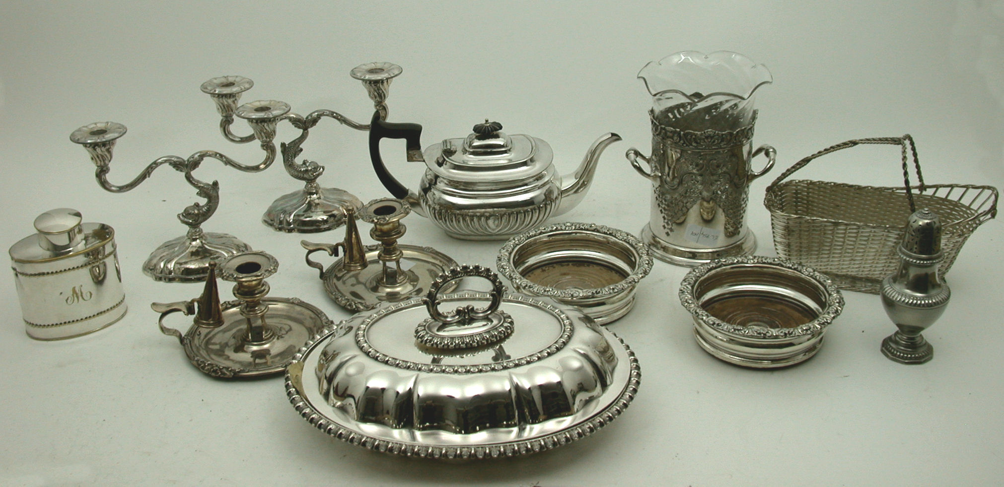 to include a pair of Sheffield plate bottle coasters, a Christofle bottle stand of woven design, a four-light candelabrum, a three-light candelabrum, a pair of two-light candelabra with dolphin cast supports, several candlesticks, entree dishes, teapots and other pieces (2 boxes)