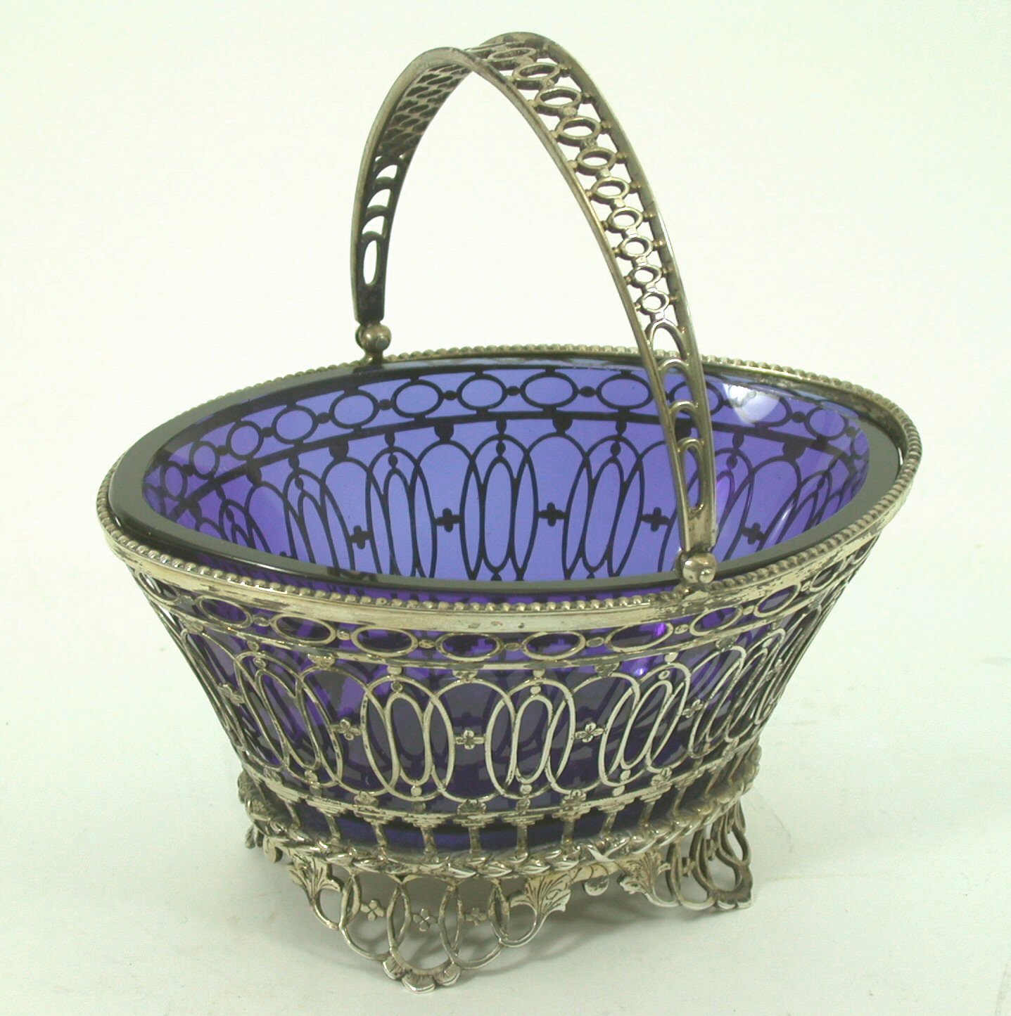 of oval outline, with circular pierced sides, bead and foliate cast borders and swing handle, on pierced bracket feet with blue glass liner
